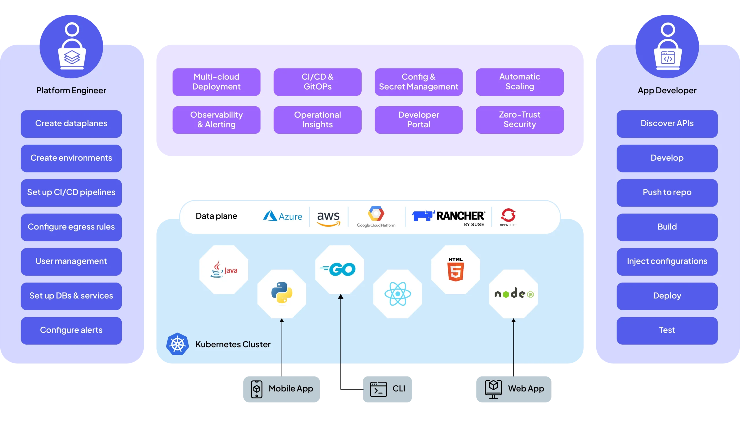 Developer UX layer: portal atau CLI untuk membuat service, pipeline, dan mengakses logs