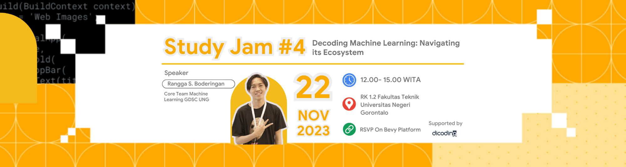 GDSC Study Jam #4 is an engaging event meticulously crafted by Google Developer Student Clubs at Universitas Negeri Gorontalo. This event serves as a platform to exploring the broader machine learning ecosystem, including discussions on popular frameworks like TensorFlow and PyTorch, as well as other relevant tools and libraries. Our goal is to foster a collaborative learning environment where attendees can gain hands-on experience, enhance their skill set, and connect with like-minded individuals. Join us for an immersive learning experience, where we unravel the complexities of Machine Learning and explore the vast ecosystem that surrounds it, during this edition of GDSC Study Jam.