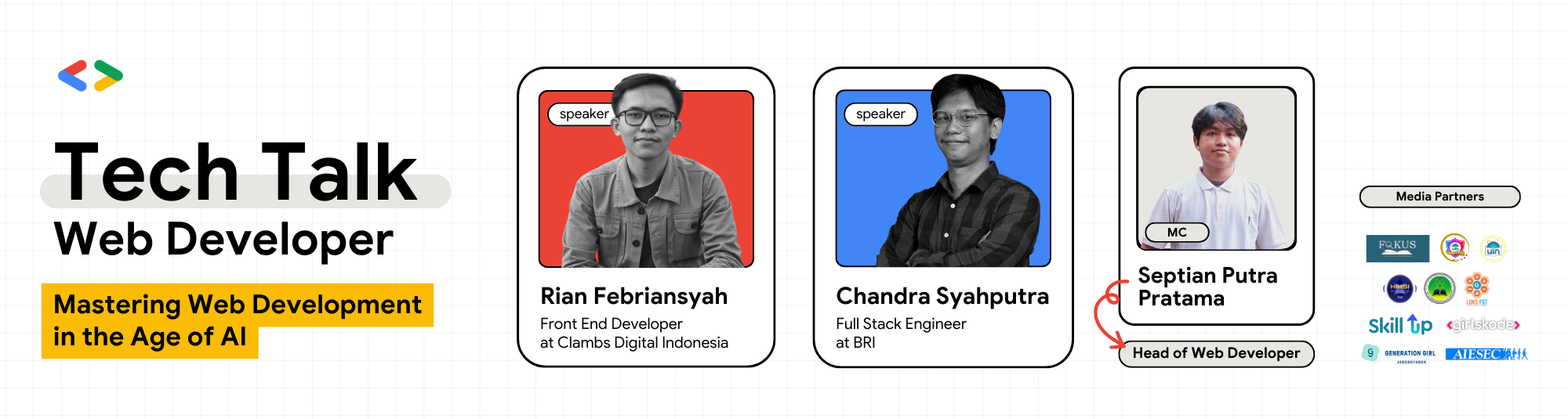 Hi everyone! How are you doing today? Hope it went well. Tech Talks is an event provided by Google Developer Student Clubs UIN Syarif Hidayatullah Jakarta to discuss topics that you are interested in. We will discuss about Web Development in the AI era which is one of the work programmes that must be implemented to provide insight into the skills and knowledge needed to keep up in the AI Automation era as a Software engineer, especially web development.